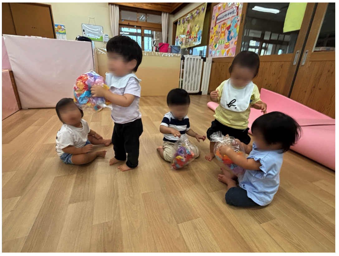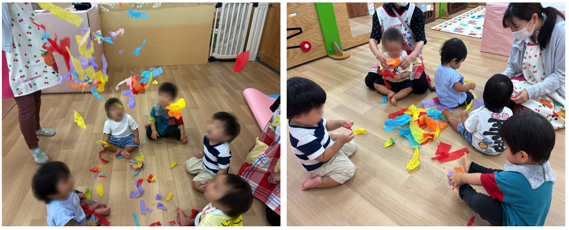 今日は乳児クラスの子どもたちと「花紙」を使って遊びました。
