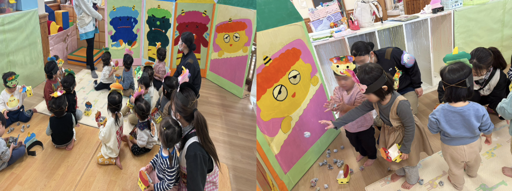 乳児クラスは、オニが描かれたボードに向かって新聞紙を丸めた豆を投げました。