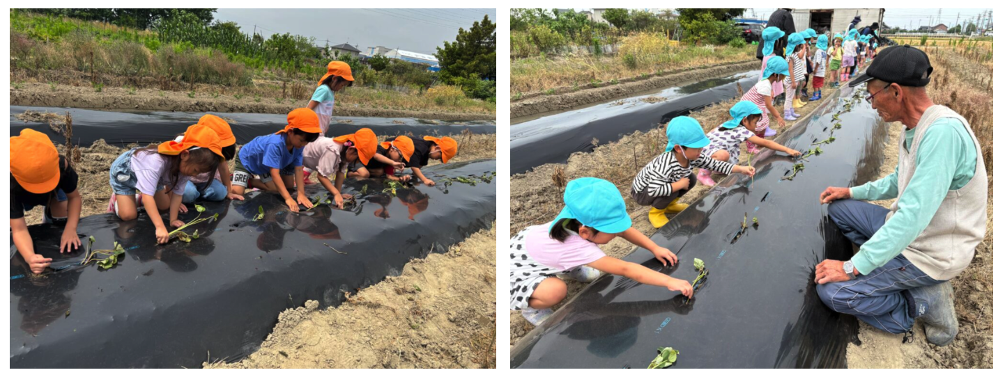 大きな芋畑に、年中組と年長組合わせて60名程で苗を植えました。
