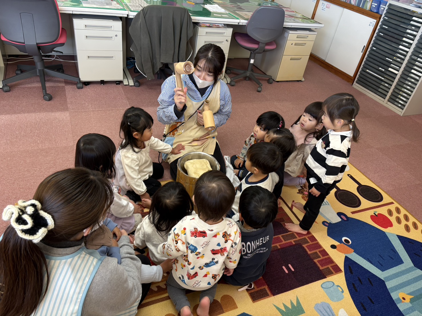 大きな石臼や杵の代わりに、粘土とペットボトルで作ったお手製の「お餅つきセット」で、お餅つきごっこを楽しみました。