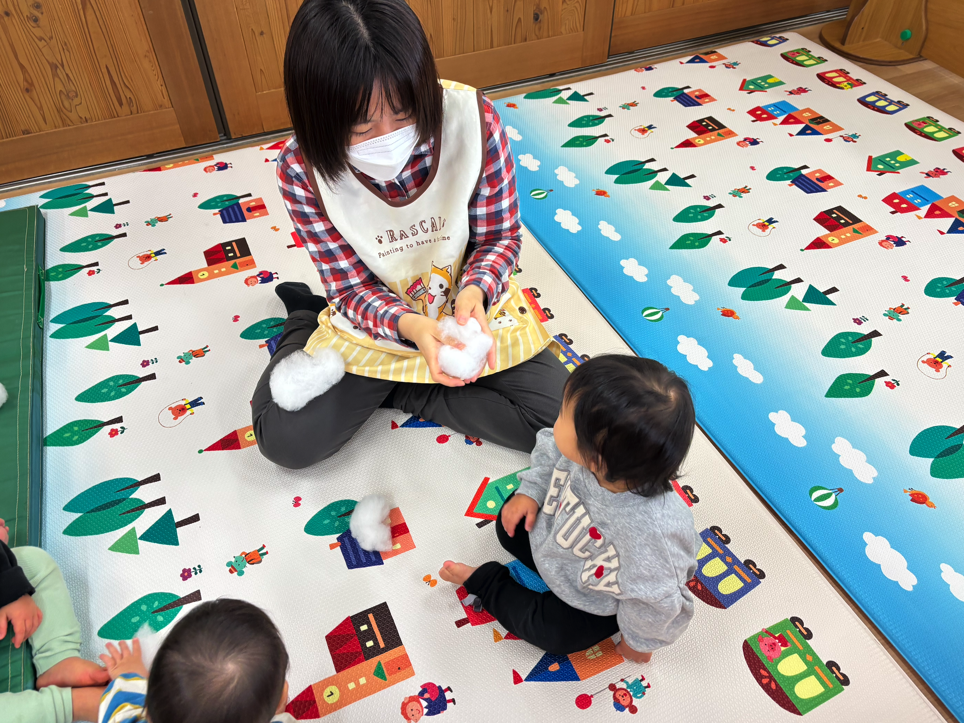 わたを使って「ふわふわ」する感触を楽しみました。見た目のイメージもとってもふわふわしていて、先生と一緒にふわふわのイメージを膨らませながら、楽しく遊びました。