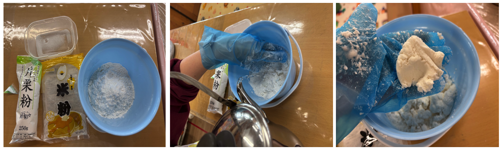 初めは米粉、塩、水、の配分を調整しながら米粉粘土を作成しましたが、なかなかうまく固まらず、、そこで片栗粉を追加で調合。するととても良い感じの粘土が完成しました。