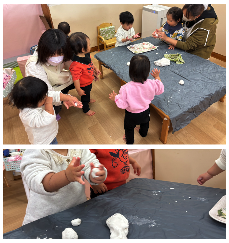乳児さんは「ふわふわわた遊び」「手作り粘土遊び」を行いました。