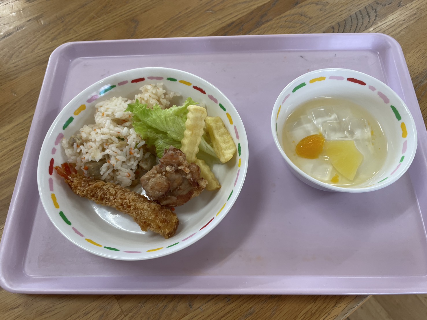 唐揚げ、エビフライ、ポテト、ピラフ、フルーツポンチでした