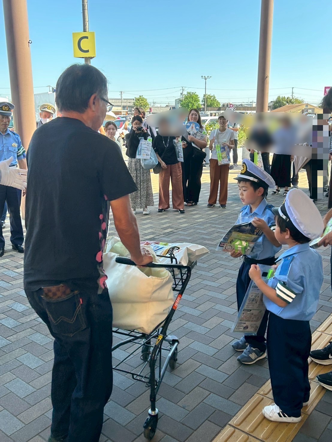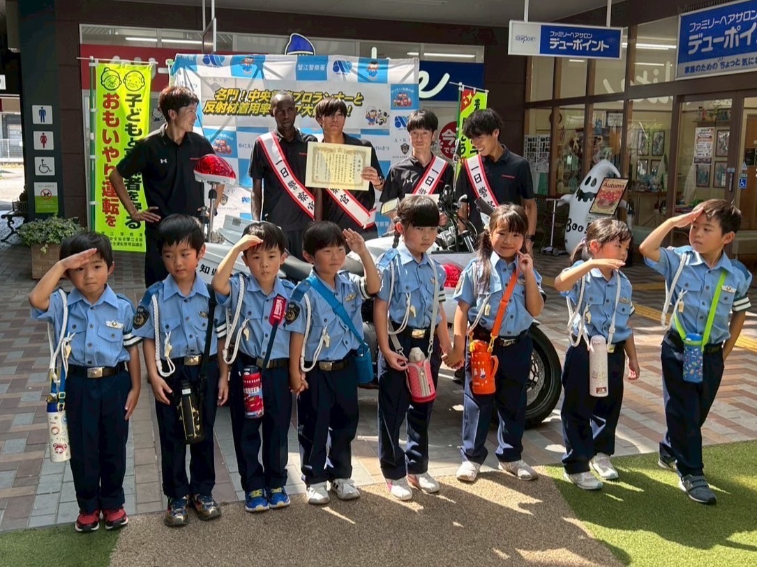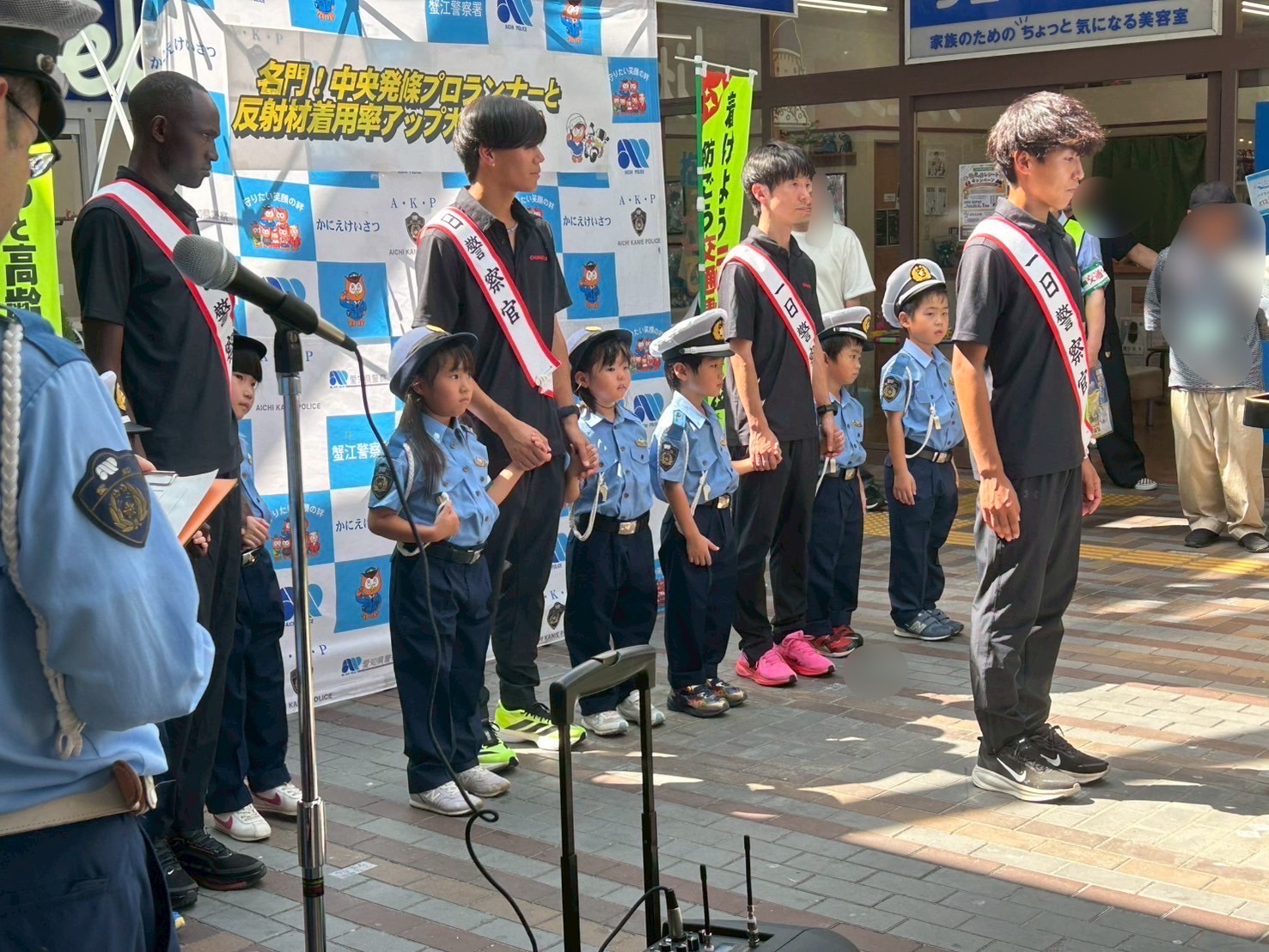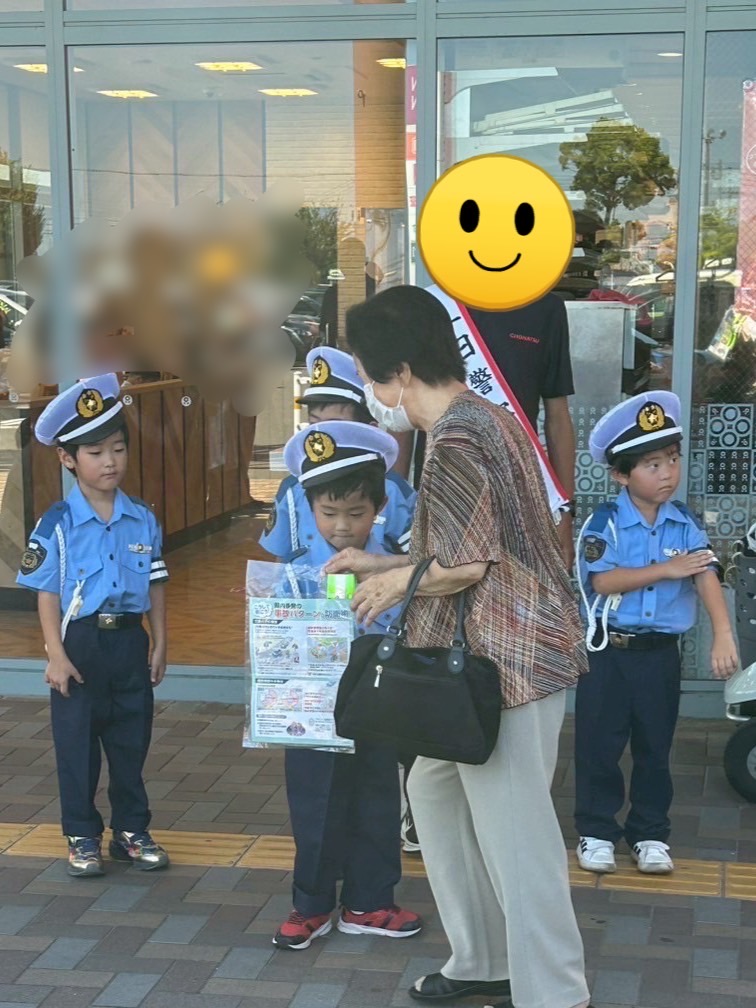 弥富はばたき幼稚園の子供数人が警察官の制服を着て反射材を配る